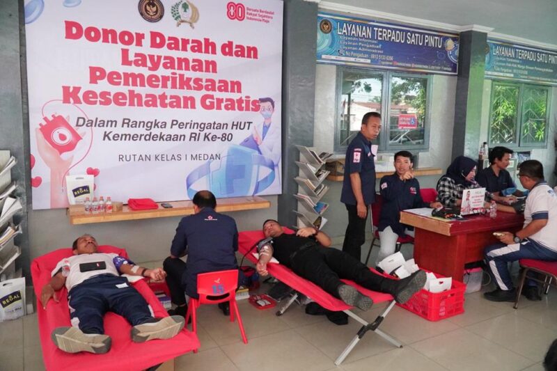 Medan – Dalam rangka memeriahkan HUT ke-80 Kemerdekaan RI, Rumah Tahanan Negara (Rutan) Kelas I Medan Kanwil Ditjenpas Sumut menggelar kegiatan senam sehat, donor darah, hingga pemeriksaan kesehatan gratis bagi pegawai dan masyarakat, Sabtu (23/8/2025).