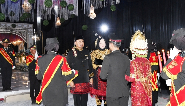 ACEH TIMUR – Kapolres Aceh Timur, Polda Aceh, AKBP Irwan Kurniadi, S.I.K. bertindak sebagai Inspektur Upacara Tradisi Pedang Pora pada pernikahan Ipda dr. Muhammad Adji Pangestu (PS Pamin DVI Sidokpol Satkes Mabes Polri Pusdokkes Polri) dengan dr. Viatun Nufus di Gedung Idi Sport Center, Selasa, (02/09/2025) siang.