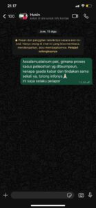 Hal ini berawal pada hari senin tgl 11 korban pelecehan seksual mendatangi kantor WH aceh timur untuk melaporkan kejadian yang menimpanya namun pihak penyidik WH mengatakan kami akan berkoordinasi dulu dengan pihak kepolisian, sejak saat itu hingga bulan september pihak penyidik wilayatul hisbah tidak pernah memberikan informasi lanjutan atau memanggil korban/ pelapor, bahkan pelapor mencoba mengubungi penyidik yang bernama husen melalui telpon seluler maupun pesan whatsap namun tidak ada jawaban, bahkan saya sudah memohon kepada Kasatpol PP Dan WH ( ampon amran) melalui pesan whatsap, beliau menyarankan saya untuk bersabar, sampai saat ini tidak ada kabar bagaimana tindak lanjut laporan saya. Ucap korban (bunga-red)