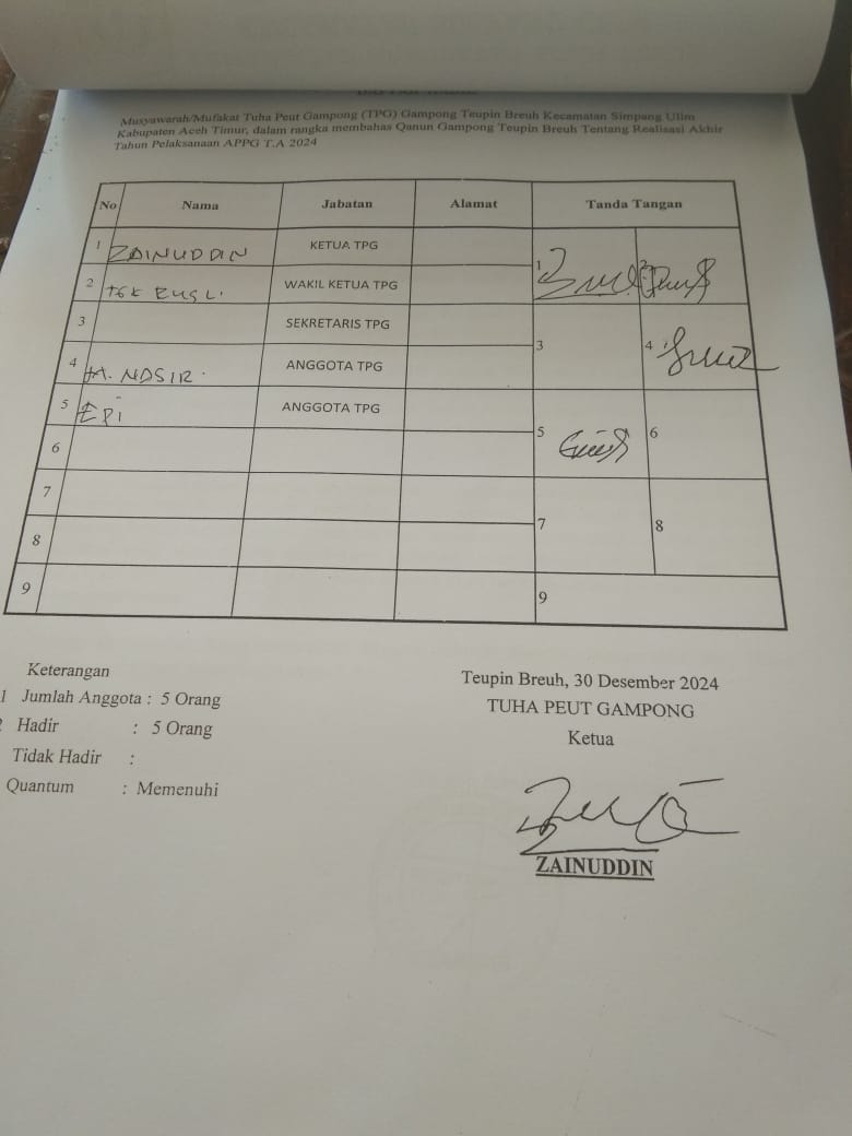Aceh Timur | Dugaan penyimpangan Anggaran Dana Desa (ADD) di Gampong Teupin Breuh, Kecamatan Simpang Ulim, berubah menjadi skandal besar. Setelah warga melapor ke Inspektorat pada 10 September 2025, kini terungkap fakta mencengangkan: tanda tangan empat anggota Tuha Peut periode sebelumnya dalam Laporan Pertanggungjawaban (LPJ) ADD 2024 diduga dipalsukan oleh keuchik.