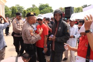 Tulang Bawang – Senin Pagi, (15/09/2025) Dalam sebuah momen yang menggugah hati, anggota polisi dari Polres Tulang Bawang terlihat memberikan bantuan kepada warga yang tengah menghadiri aksi demonstrasi. Dengan penuh perhatian, polisi tidak hanya bertugas mengamankan jalannya aksi, tetapi juga memastikan kebutuhan dasar seperti air minum tetap tersedia bagi peserta aksi.