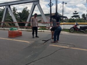 Aceh-Utara | Kapolsek Baktiya Barat , IPTU Feri Suyatna, SAP bersama geuchik wilayah setempat dan pekerja las jembatan turun langsung ke lokasi untuk memperbaiki jembatan yang besinya menonjol ke atas badan jalan tepatnya di jalan lintas nasional Medan Banda Aceh Tindakan cepat ini dilakukan untuk memastikan keamanan dan keselamatan warga yang sehari-hari menggunakan jembatan tersebut sebagai akses utama jalan nasional.