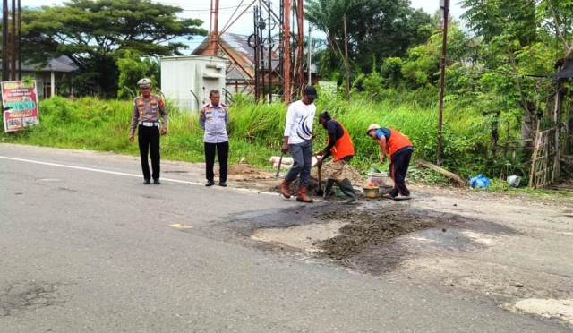 Kasatlantas Polres Aceh Timur Dampingi Dinas PUPR Balai Jalan Provinsi Perbaiki Jalan Berlubang