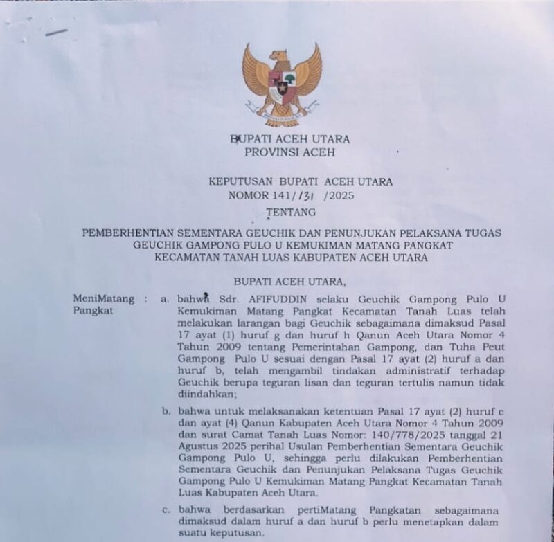 Hal itu tertuang dalam Keputusan Bupati Aceh Utara Nomor 141/131/2025, tentang Pemberhentian Sementara Geuchik dan Penunjukan Pelaksana Tugas Geuchik Gampong Pulo U Kemukiman Matang Pangkat Kecamatan Tanah Luas, Kabupaten Aceh Utara.