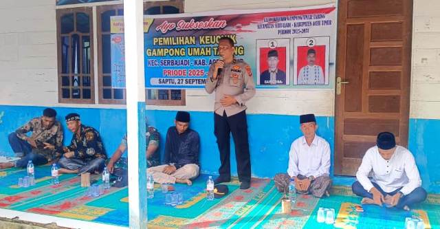 ACEH TIMUR – Kapospolsubsektor Lokop, Polsek Serbajadi, Polres Aceh Timur, Polda Aceh, Ipda Suhirman, S.H. bersama unsur Muspika Kecamatan Serbajadi memantau langsung proses pemilihan Geuchik Definitif Gampong Umah Taring pada Sabtu, (27/09/2025).