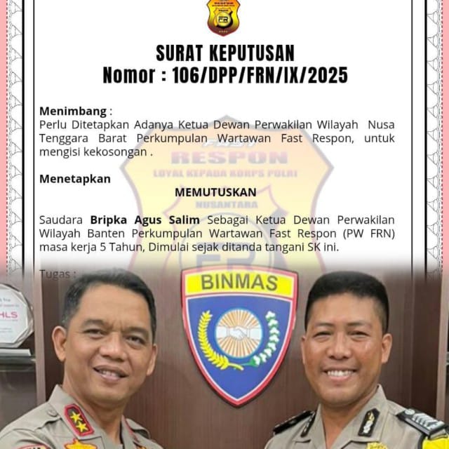 JAKARTA, 28 September 2025 – Dewan Pimpinan Pusat (DPP) Perkumpulan Wartawan Fast Respon Nusantara (PW FRN) resmi menunjuk Bripka Agus Salim sebagai Ketua Dewan Perwakilan Wilayah (DPW) PW FRN Nusa Tenggara Barat. Penetapan itu tertuang dalam Surat Keputusan Nomor: 106/DPP/FRN/IX/2025 yang ditandatangani langsung oleh Ketua Umum PW FRN, R. Mas MH Agus Rugiarto, SH.