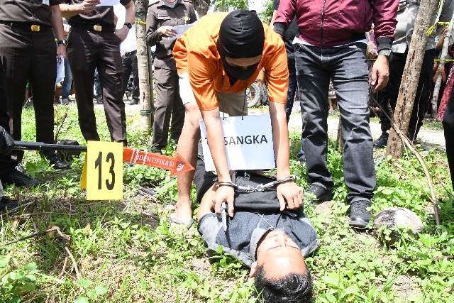 Pada adegan ke 8, korban bersedia membantu mendorong sepeda motor tersangka hingga lokasi kejadian, saat itu korban berhenti sambil memegang HP dan diadegan berikutnya tersangka memperagakan ketika mengambil pisau dari bawah jok sepeda motor, langsung menusuk punggung korban, namun korban melakukan perlawanan sehingga terjadi perkelahian, tersangka yang panik kemudian menusuk leher korban berulang kali hingga korban meninggal dunia.