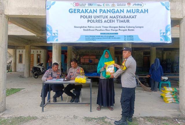 Plt. Kasat Binmas Polres Aceh Timur, Iptu Jasman, S.Sos menyebutkan, melalui GPM, Polri berupaya membantu meringankan beban ekonomi masyarakat, khususnya warga kurang mampu, dengan menghadirkan bahan pokok beras berkualitas di bawah harga pasar.