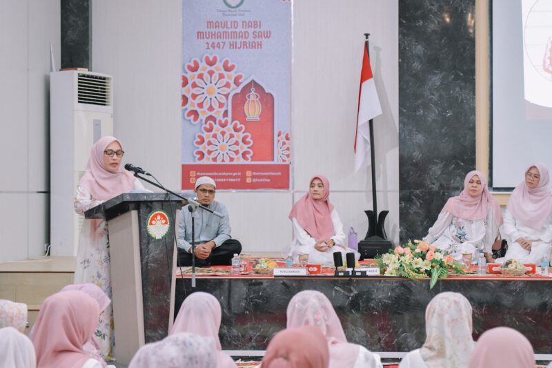 Ketua DWP Aceh, Ny. Malahayati M. Nasir, dalam sambutannya menyampaikan rasa syukur dan harapan agar peringatan Maulid tidak sekadar menjadi seremonial tahunan, melainkan menjadi momentum untuk memperdalam keteladanan Rasulullah SAW dalam kehidupan sehari-hari.