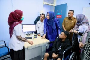 BANDA ACEH – Ketua TP PKK Aceh Marlina Muzakir, bersama Istri Ketua DPRA Aceh Rizawati Zulfadli, menyemangati Rahmat Akbar, remaja yang mengalami lumpuh layu akibat kelainan saraf asal Pulo Aceh, yang baru tiba di dermaga Lampulo, Selasa (4/11/2025).