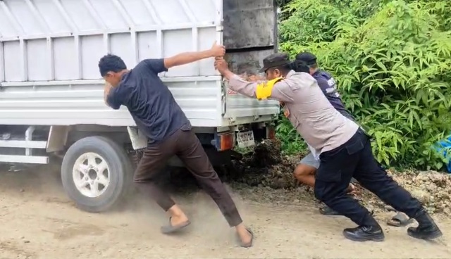 Mobil tersebut kemudian didorong oleh kedua personel Polsek Simpang Jernih dengan dibantu warga masyarakat yang melintas, sehingga bisa melewati jalan tanjakan yang rusak itu.