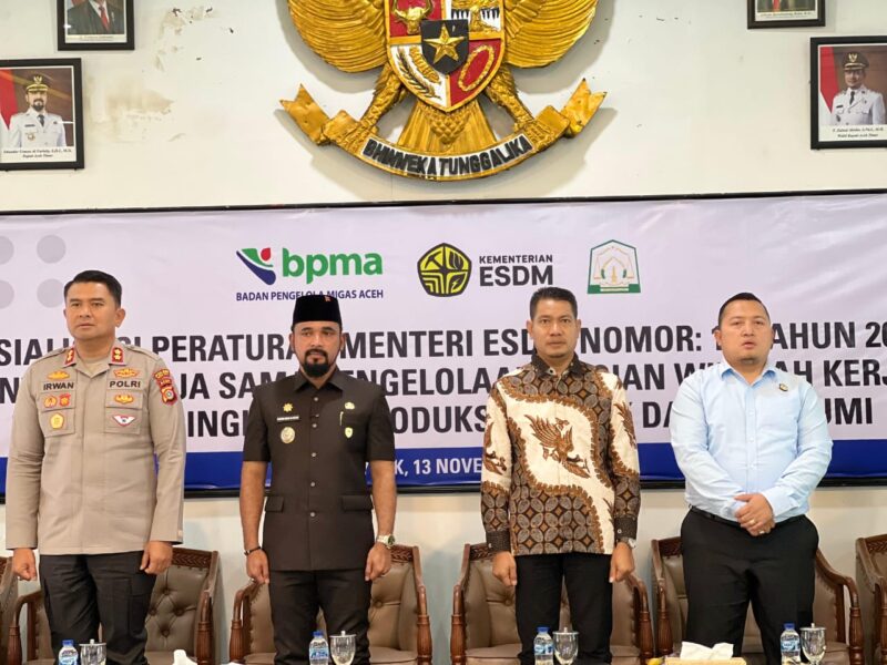 Aceh Timur – Wakil Bupati Aceh Timur, T. Zainal Abidin, S.Pd.I., M.H, mendampingi Bupati Aceh Timur, Iskandar Usman Al Farlaky, S.H.I., M.Si, dalam kegiatan Sosialisasi Peraturan Menteri Energi dan Sumber Daya Mineral (ESDM) Nomor 14 Tahun 2025 tentang Kerjasama Pengelolaan Bagian Wilayah Kerja untuk Peningkatan Produksi Minyak dan Gas Bumi.