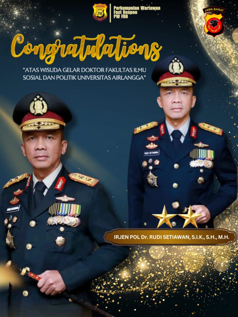 JAKARTA – Ketua Umum PW-FRN Counter Polri, Agus Flores, beserta jajaran secara resmi menyampaikan ucapan selamat kepada Kapolda Jawa Barat, Irjen Pol. Dr. Rudi Setiawan, S.I.K., S.H., M.H. Ucapan ini diberikan atas pencapaian luar biasa Irjen Pol Dr. Rudi Setiawan yang resmi meraih gelar Doktor dari Fakultas Ilmu Sosial dan Ilmu Politik (FISIP) Universitas Airlangga.