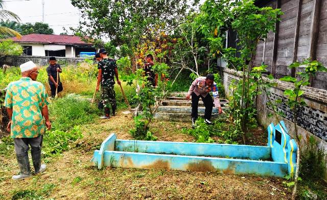 Dalam kegiatan tersebut, personel Polsek Madat bersama warga dan anggota Koramil 21/MDT melakukan berbagai aktivitas, di antaranya membersihkan sampah di area pemakaman umum, mencabut serta memotong rumput liar, hingga merapikan lingkungan sekitar makam agar terlihat bersih dan tertata.