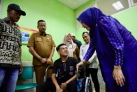 BANDA ACEH – Ketua TP PKK Aceh Marlina Muzakir, bersama Istri Ketua DPRA Aceh Rizawati Zulfadli, menyemangati Rahmat Akbar, remaja yang mengalami lumpuh layu…