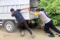 ACEH TIMUR – Dua personel Polsek Simpang Jernih, Polres Aceh Timur, Polda Aceh, Aipda Bambang Setiawan dan Bripka Saifullah membantu mendorong mobil yang terjebak…